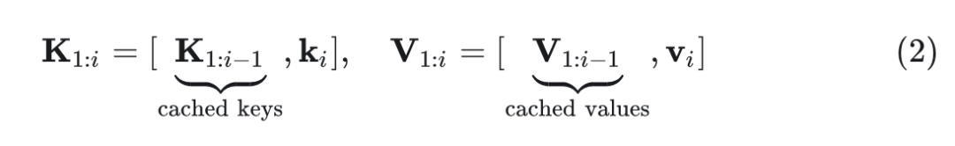 其中, 为第 个 token 的 query 向量。 为前 个 token 的 key,value 矩阵。KV Cache 可以存储之前步骤的 Key 和 Value: ,使得计算变成: