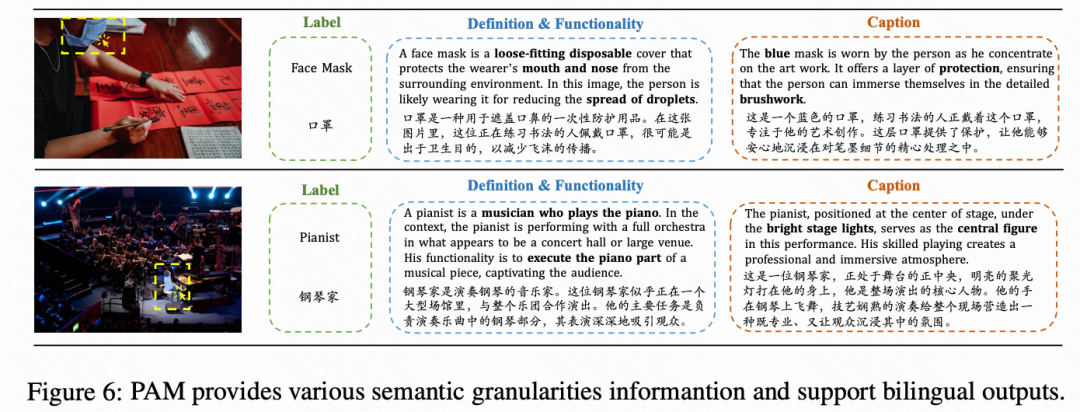 如下表1所示,PAM-1.5B 和 PAM-3B 都展现了强劲的性能。值得注意的是,PAM-3B 显著优于其他竞争方法。它在 PACO 基准上取得了最佳性能,超过此前最优模型超过 ,并在 LVIS 基准上在语义 IoU 指标上超过了当前的 SOTA 模型 DAM-8B。此外,如下表1右栏所示,PAM-3B 在 Total-Text 上超过VP-SPHINX-13B 超过 ,并在 COCO-Text 上取得了相当的性能。这些结果展示了其在场景文字识别中的潜力。进一步在图6中展示了定性可视化结果,说明 PAM 在生成涵盖目标通用定义与上下文角色的解释方面的有效性。