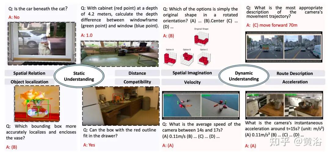 静态理解任务的输入包括一张图像和对应的问题,不涉及时间或视角的变化。这类任务主要包括理解物体之间的空间关系、物体定位、距离测量和空间兼容性推理。