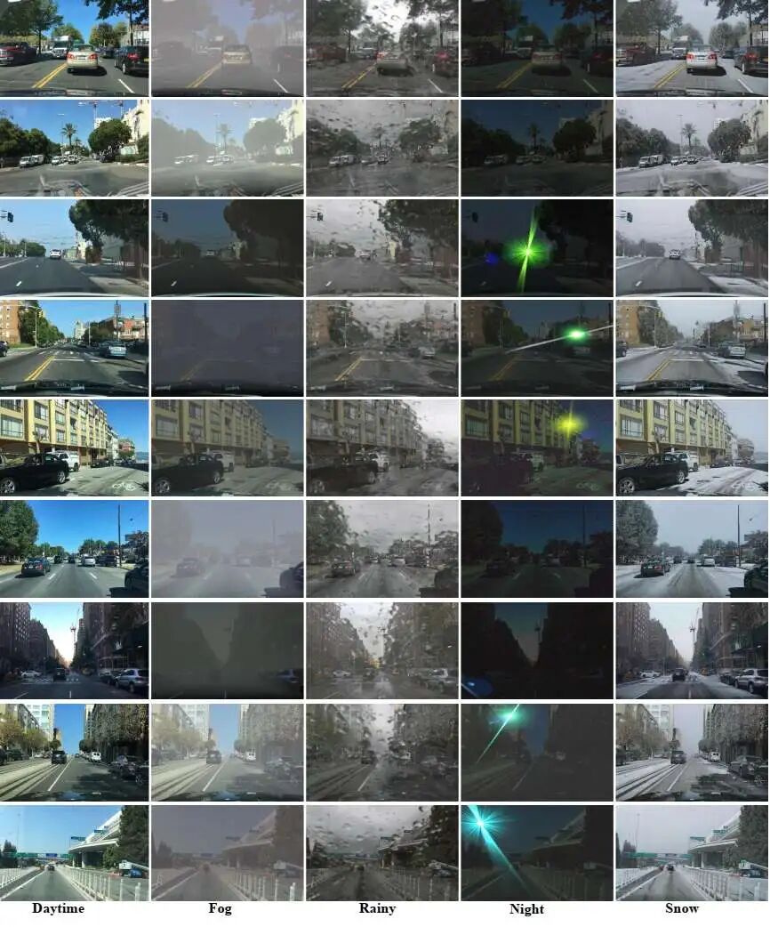 在自动驾驶等现实应用场景中,视觉感知系统常常受到多种天气退化(如雨、雾、夜间、雪)的影响。传统的单任务方法依赖特定先验知识,而 all-in-one 方法只能解决有限的退化组合同时又存在严重的领域差异,难以应对复杂的实际场景。