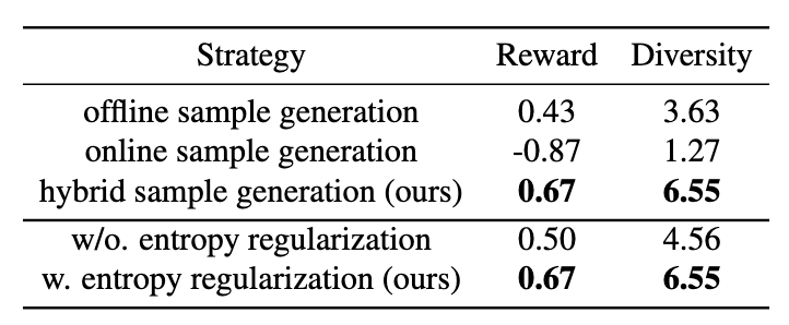 样本生成策略对比:混合采样策略(结合离线和在线的优势)在奖励分数和响应多样性方面均表现最佳。它既能保证训练的稳定性,又能提供足够的探索空间,优于单纯的离线或在线采样。 -