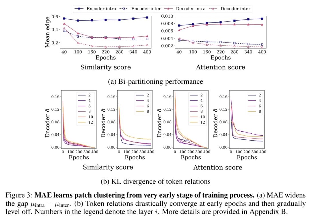 发现MAE内在学习机制:通过深入分析发现MAE在预训练的早期阶段就内禀地学习基于模式的块级聚类,这一特性在预训练的极早期阶段就已显现。 -