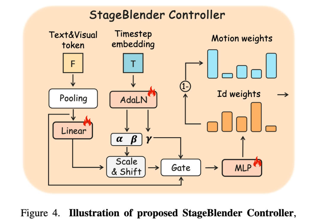 具体来说,阶段融合控制器根据去噪时间步和融合的文本-视觉特征,动态生成多组针对不同DiT深度层的缩放权重。
