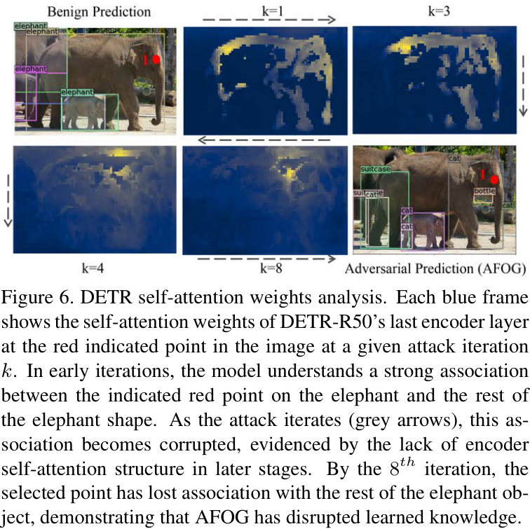 研究者还深入分析了AFOG是如何“搞破坏”的。下图通过可视化DETR编码器自注意力图的变化,揭示了AFOG的攻击过程。在攻击初期,模型能正确地将大象身体的各个部分关联起来。随着攻击迭代,这种关联性被逐渐破坏,最终导致模型无法识别出完整的大象。