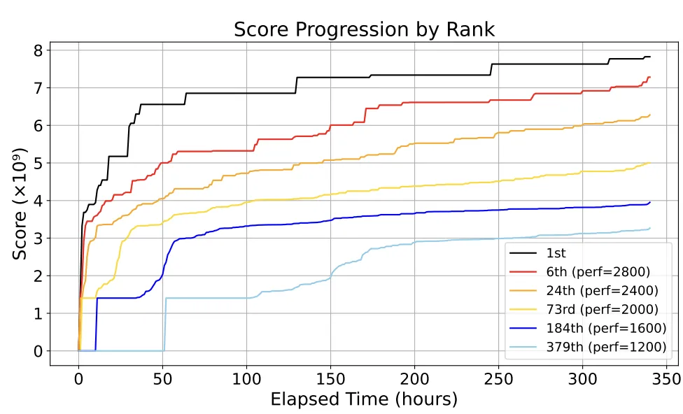 在为期两周的AHC014竞赛中,图3展示了每个时间点上特定排名的得分显示出持续的进步。
