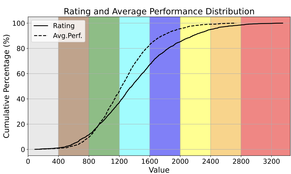 图4:评级和平均表现分布。截至2025年5月1日,至少参与过5次的用户的累积评级和平均表现分布(背景颜色表示不同的评级层级)