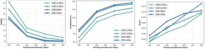 作者观察到,随着模型尺寸的增加,更大的 Encoder 有利于进一步提高性能。对于图 11 中的基本模型,最佳配置显示为 8 Encoder+ 4 Decoder,提供卓越的性能和收敛速度。值得注意的是,图 12 中更大的模型表现出明显的偏好,使用 20 Encoder+ 4 Decoder 实现了峰值性能,这个 Encoder-Decoder 的比例更激进。这种意想不到的发现促使作者将 DDT-XL/2 比例缩放到 22 Encoder+ 6 Decoder 来探索 DiT 架构的性能上限。