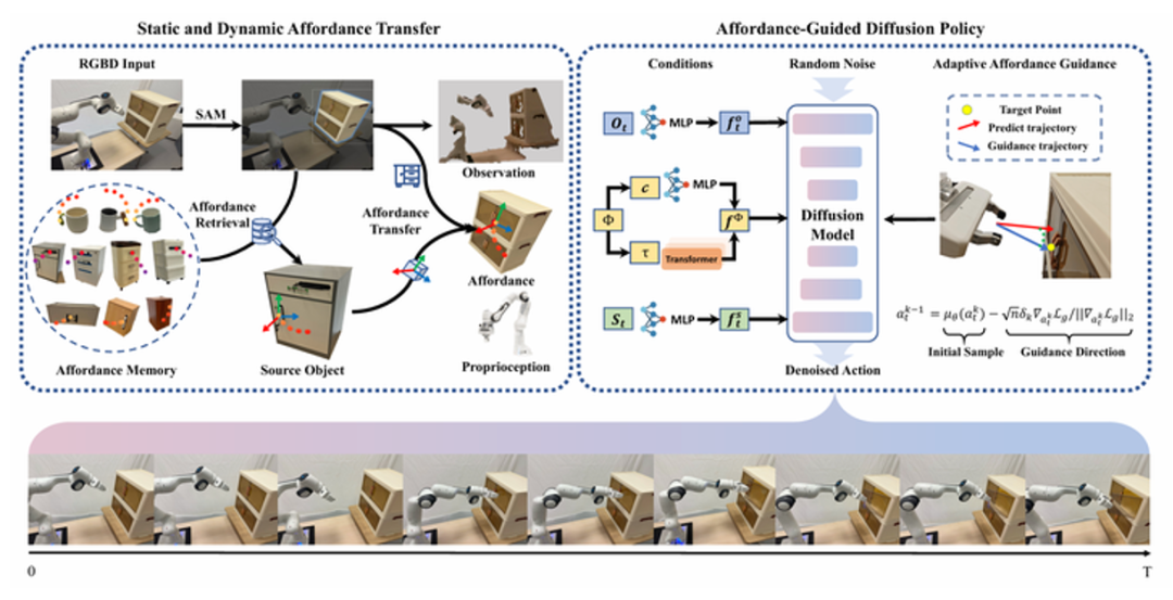 近年来,基于扩散模型(diffusion-based)的模仿学习在灵活性和多样性上展现了巨大潜力,但在面对域外分布场景时,仍普遍缺乏足够的泛化能力,难以适应未知物体的不同形态或类别。相比之下,人类能轻松将所学技能迁移到外观和类别不同的目标上,其关键在于对“在哪里”以及“如何”与物体交互的先验认知,即可概括为“Affordance”。然而,现有研究大多只在带轨迹的二维接触点、关键帧或价值图等较为局限的层面利用了Affordance,难以涵盖交互中的动态变化。为克服现有扩散模型在泛化方面的不足,引入包含静态和动态信息的通用Affordance表征至扩散策略,并在采样过程中对其进行精细化指导,不仅能有效迁移交互先验知识,也可进一步拓展扩散模型在未知物体及新类别场景下的机器人模仿学习应用。