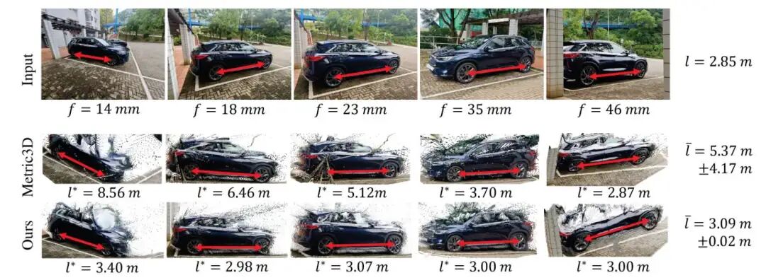 3D度量学:在14mm到46mm五档焦距下,对汽车轮距等物理长度进行单目测量,传统方法平均误差5.37±4.17mm;DM‑Calib误差收敛至3.09±0.02mm,且误差方差显著缩小,DM‑Calib在室内外多焦距条件下均能给出更精确、稳定的尺寸估计: