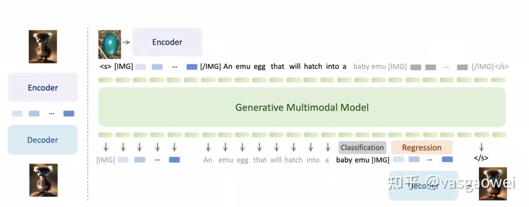 EMU的结构如图Fig 4所示,包含四个部分,Visual Encoder(文中用的EVA-02-CLIP)、Causal Transformer、Multimodal Modeling(LLaMA)和Visual Decoder(Stable Diffusion)。