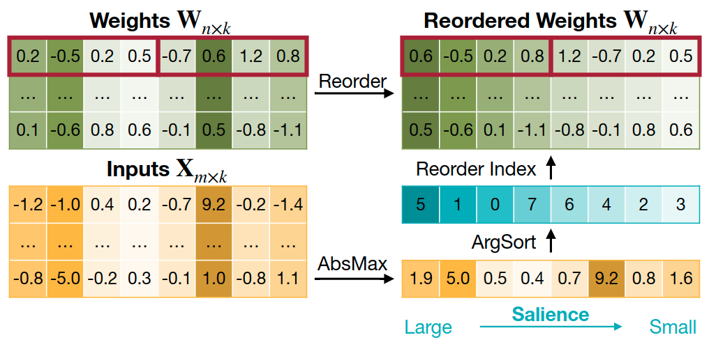 Atom[2]和 AWQ[4]都观察到将一些重要的权重 (salient weights) 维持在 FP16 可以提升模型精度。这些 salient weights 可以通过 activation 的分布来识别。作者使用激活感知通道重新排序。使用 \max\left(|\mathbf{X}|\right) 来确定权重 channel 的显著性,然后重新排序通道,使具有相似显著性的通道在同一个量化组中。