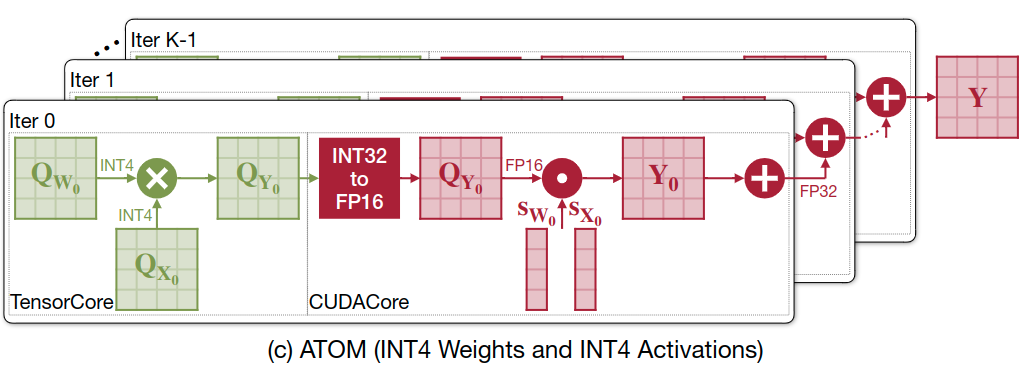 在 FP16 和 W8A8 GEMM (图 5) 中,主循环完全在 TensorCore 上执行。