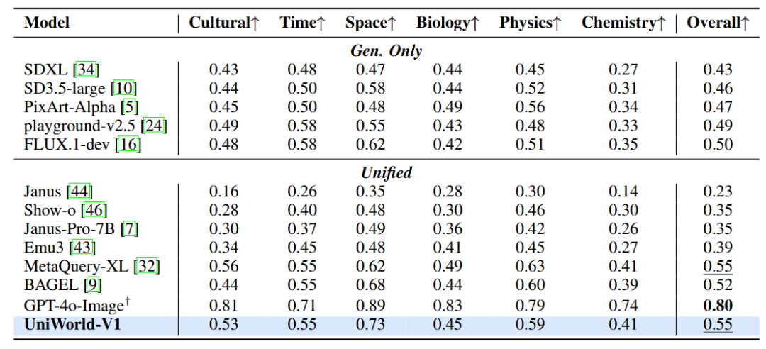 在 GenEval 测试中,UniWorld-V1 取得总体 0.79 分;使用与 BLIP3-o 相同的提示重写后得分提升至 0.84,已非常接近 BAGEL 的 0.88。在 WISE 基准上,UniWorld-V1 综合得分 0.55,尤其在“空间”类题材中获得 0.73 分,仅次于 GPT-4o-Image 的 0.89,位列其他统一模型之首,展现了其在整合世界知识生成图像方面的竞争力。
