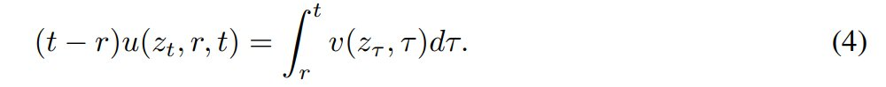 文章提出使用平均速度(在时间间隔内的位移与时间的比值)来代替流匹配中通常建模的瞬时速度。然后本文推导出平均速度与瞬时速度之间存在一个内在的关系,从而作为指导网络训练的原则性基础。