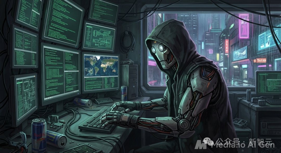 赛博朋克风格也没问题,比如身处未来高科技环境中的赛博朋克机器人黑客,正面对多块显示器进行操作。