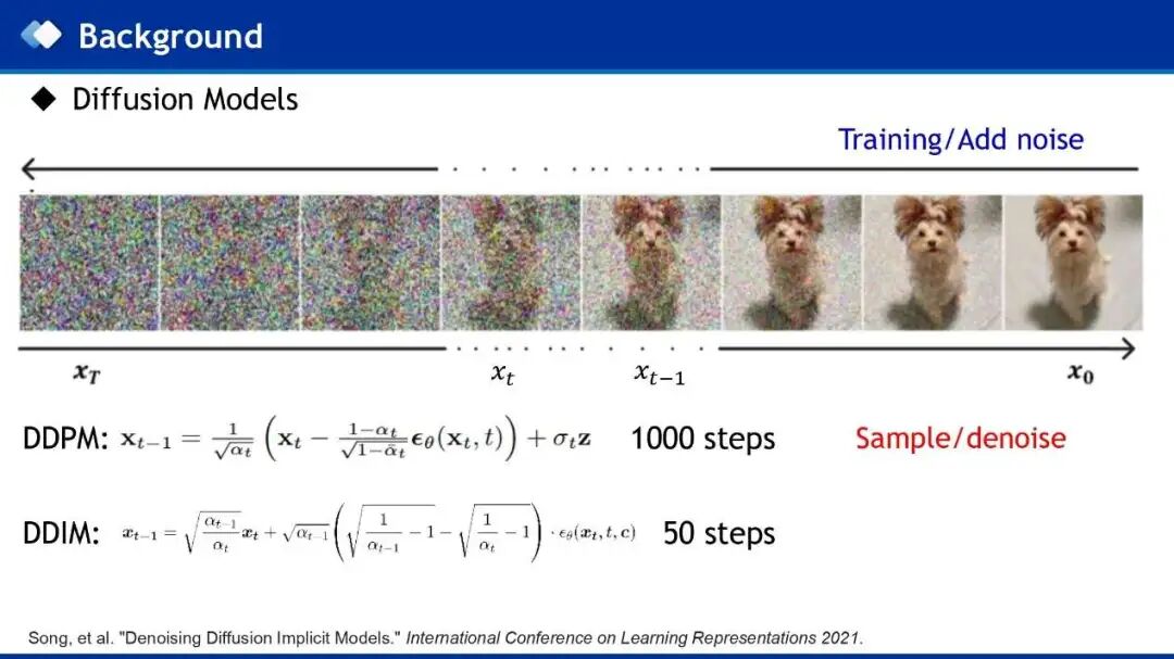 扩散模型之所以需要几十步的推理步数,是因为其是一个逐渐加噪去噪的过程,如图所示,从右到左的训练过程是前向加噪过程,从左到右的采样过程是逐渐去噪过程,从高斯噪声逐渐去噪生成干净的图像,原始的扩散模型采用1000步的DDPM策略去噪。虽然后来提出非马尔可夫的DDIM采样策略,将采样步数降到50步,但这个过程仍然非常耗时,成为主要的效率瓶颈。