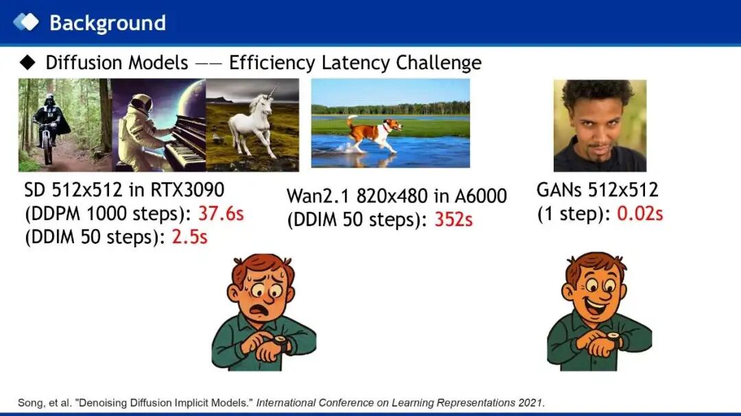 比如StableDiffusion生成一张512的图,采用DDPM 1000步采样需要37.6s,采用DDIM 50步采样也需要2.5s,50步生成一个视频则需要352s。