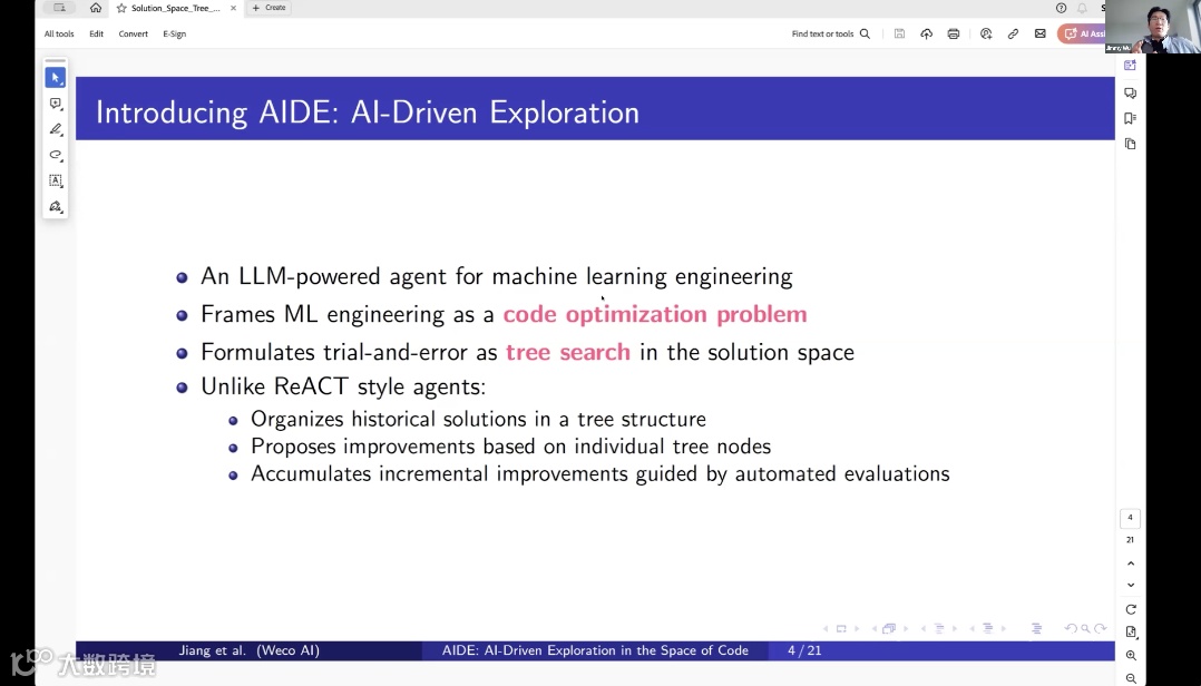 初创公司 Weco Al 的 CTO Yuxiang 做了题为《AlDE: Searching Intelligence in the Space of Solutions》的分享,阐述在解空间中寻找智能的新思考,介绍了一种由人工智能驱动的强大的 Agent—— AIDE。