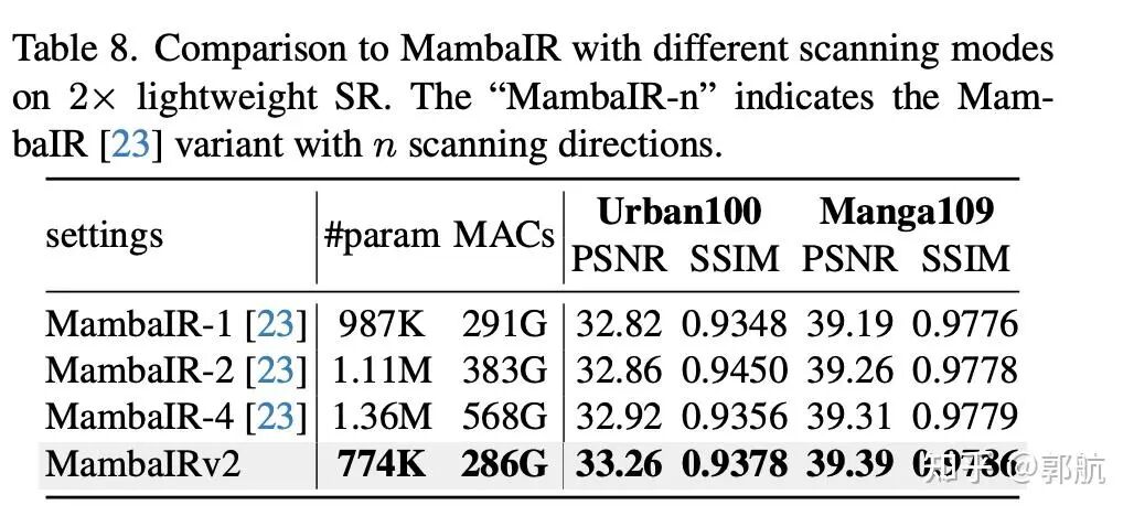我们的MambaIRv2在lightSR任务上用更少参数实现了比SRformer更好的结果 -