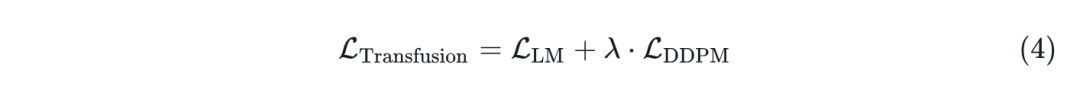 为了训练本文模型,作者将语言建模目标 LM Loss 应用于文本标记的预测,将扩散目标 DDPM Loss 应用于图像 patch 的预测。LM Loss 是 per-token 计算的,而 DDPM Loss 是 per-image 计算的,这可能会跨越序列中的多个元素(图像 patch)。具体来说,根据扩散过程为每个输入 添加噪声 ,在 patchification 之前产生 ,然后计算图像级扩散损失。通过简单地将每个模态上计算的损失与平衡系数 结合起来: