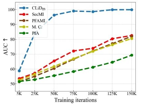 从上图可以观察到,随着训练的进行, 的有效性轨迹显著更快上升。在 25,000 步时, 有效暴露了成员信息,而其他基线方法大约在 150,000 步时才能达到类似效果。这表明本文方法能够在文生图扩散模型的过拟合程度尚较弱时,更有效地揭示成员信息。