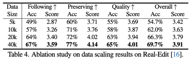 通过5k至40k样本量的实验探究了训练数据规模对模型性能的影响。下表4显示随着数据量增加,所有指标均持续提升。仅用5k样本时,模型已达到合理性能(54.7%准确率,3.92总分),而扩展至40k样本时获得显著增益(69.7%准确率,3.91总分)。其中保真度和质量指标的提升最为突出,分别达到10%和15%。所有数据点呈现的上升趋势表明,SuperEdit能有效利用新增训练样本且未出现性能饱和,这意味着扩大数据集仍有提升潜力。