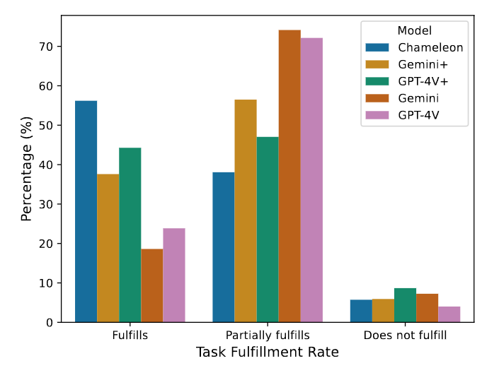 对于 absolute 评估,通过询问 3 个不同的注释者一组关于响应相关性和质量的问题来分别判断每个模型的输出。对最关键的问题进行了详细的结果和分析,即 Response 是否满足 Prompt 中描述的任务。如图 13 所示,Chameleon 的响应被认为更多完成任务:Chameleon 为 55.2%,Gemini+ 为 37.6%,GPT-4V+ 为 44.7%。