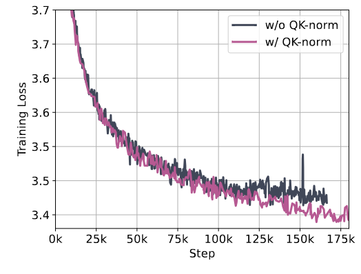 为此,作者使用 QK-Norm。QK-Norm 通过将 LayerNorm 应用于 Attention 中的 Query 和 Key 向量直接控制输入到 Softmax 的范数增长。
