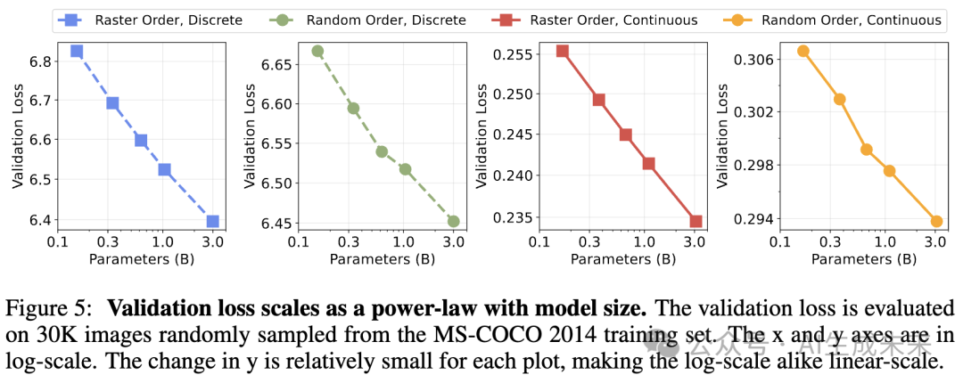 验证损失随模型规模线性扩展。在下图5中,研究者们考察了四种自回归变体在验证损失方面的扩展行为。验证损失和模型规模在对数空间中呈现线性关系,模型规模从1.5亿参数增加到30亿参数。这与Henighan等人发现的幂律规律相一致。这表明,增加模型规模所带来的训练损失改进能够很好地泛化到与训练数据不同的验证数据上。