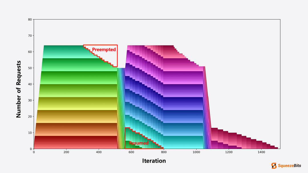 在图中,可以观察到预警的存在。被中断的请求会从调度中移除,并在后续迭代中恢复。尽管存在预警,连续批处理的模式在图 7 中仍然清晰可见。