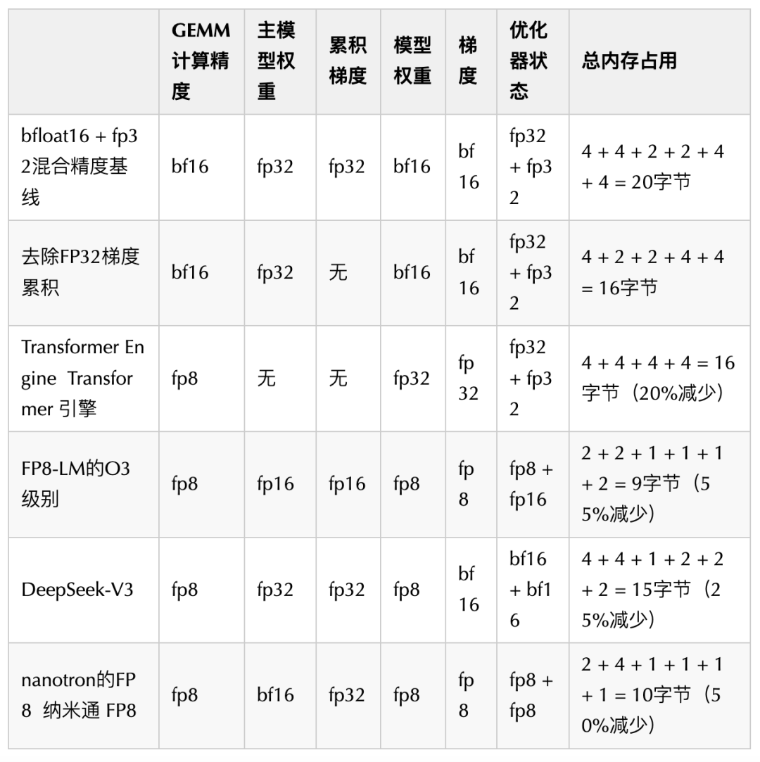 为了从高精度(如FP32或BF16)切换到更低精度(如FP16或FP8)并适应更小的数值范围,需要对激活值的范围进行归一化,例如计算其绝对最大值。DeepSeek-V3进一步引入了一种特定的量化方案,其中范围按块(tile)归一化:输入/激活使用1×128,权重和缩放因子使用128×128。这种方法使归一化过程不易受到激活值中异常值的影响。此外,他们还提出了一些额外的技巧,以进一步减少内存和通信开销,具体内容可以在DeepSeek-V3技术报告的第3.3节中找到。以下是一些已知的FP8训练方法的总结: