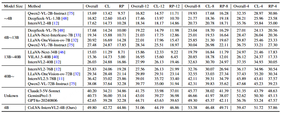 集成了CoLVA的InternVL2-4B模型准确率达到**49.80%,超越GPT-4o达7.15%,超越最强开源模型Qwen2-VL-72B达11.72%**,实现新SOTA;