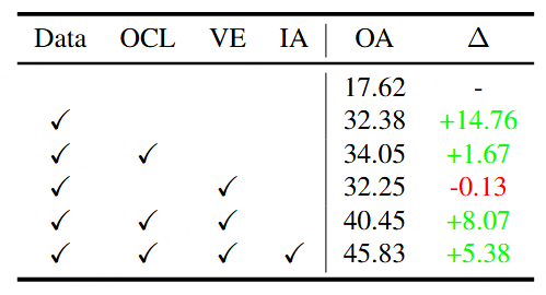 增加对象级对比学习(OCL)与精细视觉专家(VE)后进一步提升至40.45%;