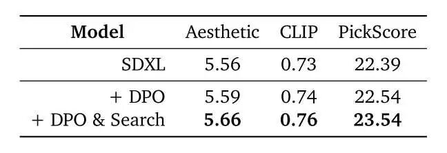 论文展示了在 Diffusion-DPO 中的 SDXL-DPO 上应用噪声搜索的实验结果。可以看出,噪声搜索同样兼容偏好微调模型。