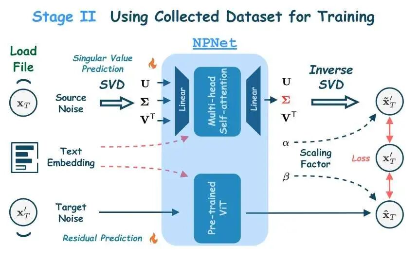我们再简单看一下噪声预测网络的设计。这个网络会根据输入的差噪声 输出语义贴合度高且质量更高的噪声 。作者发现,每对噪声的 SVD(奇异值分解)结果非常相似。因此, Golden Noise 设计了一个两路网络:一个网络根据输入噪声,输出预测噪声的大致 SVD,它决定了最终噪声的主要内容;另一个网络根据输入噪声和文本嵌入,输出一个残差噪声,用于补充细节。