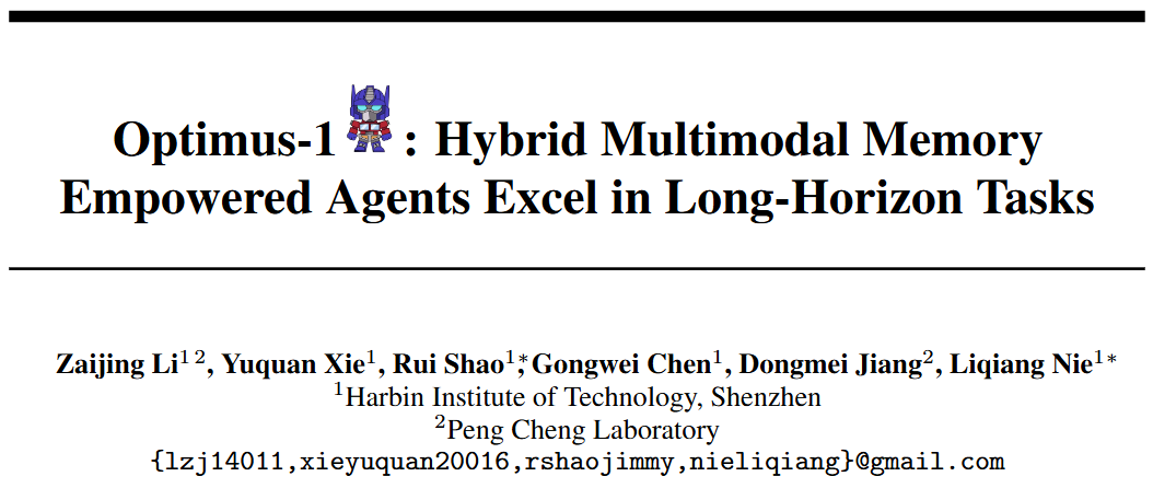 论文题目:Optimus-1: Hybrid Multimodal Memory Empowered Agents Excel in Long-Horizon Tasks -