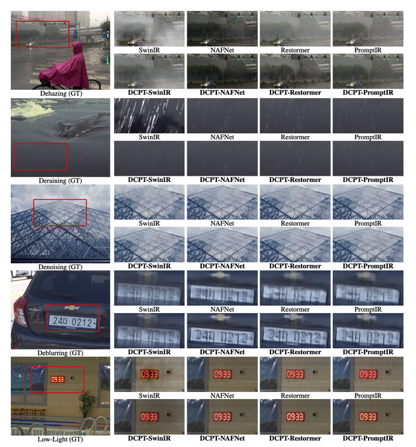 可以看出,无论是 CNN 网络还是 Transformer 网络,无论是直线网络还是类 UNet 网络,DCPT在 5D All-in-one image restoration 任务上的平均性能提升始终保持在 2.08 dB 及以上。