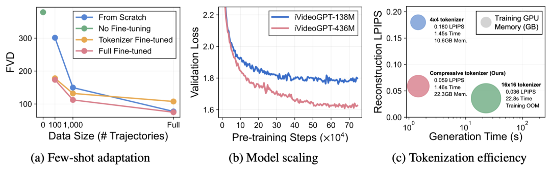 模型扩展:通过增加计算可以构建更强大的 iVideoGPT,符合 Scaling Law; -