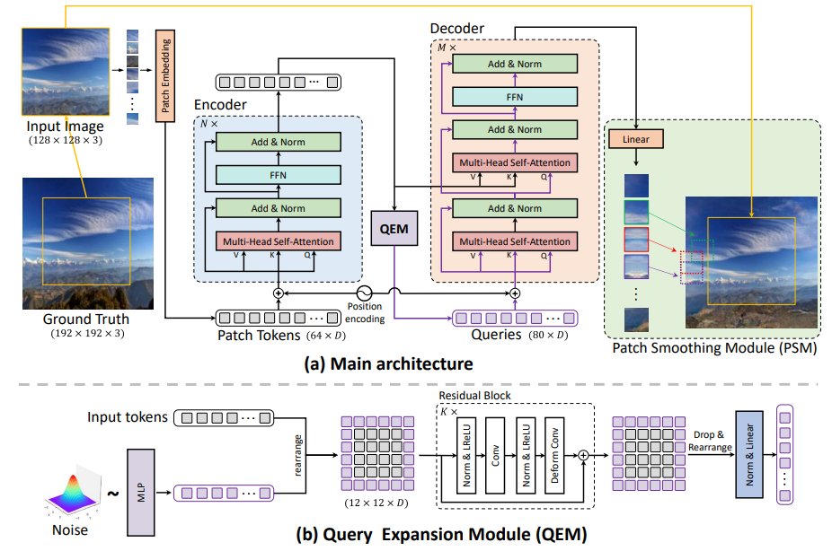 提出 Query Expansion 和 Patch Smoothing 模块,解决纯 Transformer 模型中的慢收敛问题,并生成平滑且无缝的逼真外推图像。 -