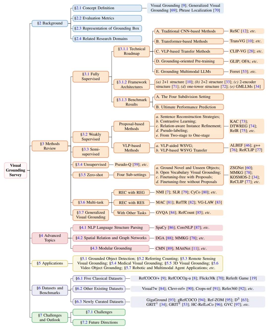 (v) 据我们所知,这篇综述是目前在视觉定位领域最全面的综述。作者希望本文不仅可以助力于新手入门Grounding,也希望可以帮助有一定研究基础的人对当前的研究进行梳理,使他们能够跟踪并对最新的进展保持了解。