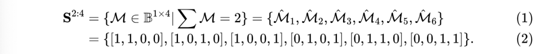 对于 2:4 稀疏性, 二进制掩码 必须恰好包含两个零,从而形成一个离散的候选集 ,其大小为 个候选: