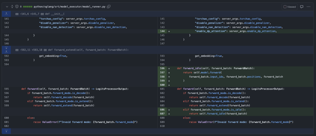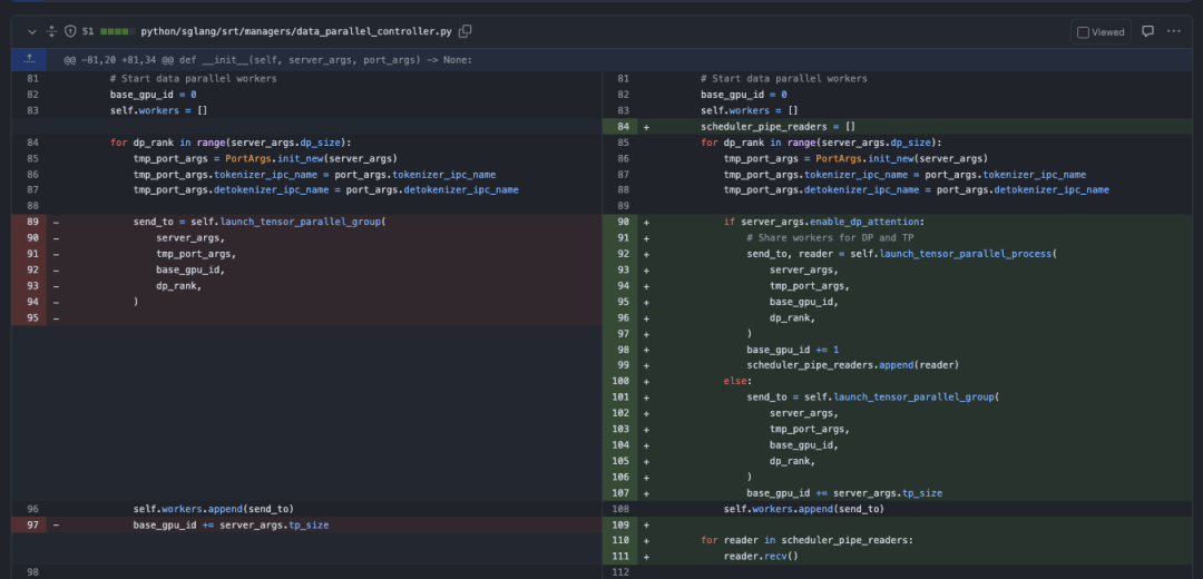 接下来就关注一下和Data Parallelism Attention优化相关的更底层的改动,包括managers 和 model_executor 两大方面。实际上涉及到的改动包括SGLang的TPModelWorker(https://github.com/sgl-project/sglang/blob/main/python/sglang/srt/managers/tp_worker.py) 和 ModelRunner(https://github.com/sgl-project/sglang/blob/main/python/sglang/srt/model_executor/model_runner.py) 两个部分,当然还有负责TpModelWorker调度相关的Scheduler部分也做了对应修改,但改的东西其实不多,下面分点看一下。