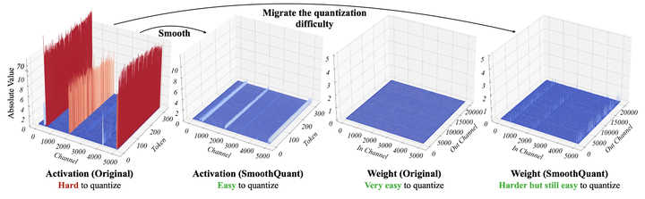 SmoothQuant 基于的一个事实是 weight 相比于 activation 更容易去量化,因此通过离线将量化的难度从 activation 通过数学上的等价变换转移到 weight 上来。