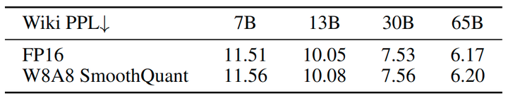 通过初步实验,作者发现与 OPT 和 BLOOM 等模型相比,LLaMA 模型通常具有不太严重的激活异常值问题。尽管如此,SmoothQuant 对于 LLaMA 模型仍然很奏效。作者在图12中提供了 LLaMA W8A8 量化的一些初步结果。SmoothQuant 使 W8A8 量化性能的下降可以忽略不计。