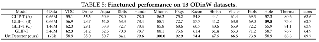 为了进一步证明我们的UniDetector检测每个场景中一切事物的能力,我们遵循[113]在13个ODinW数据集上进行实验。这些数据集涵盖了各种领域,如航拍、水下、热成像,因此也具有多样性的类别。这种属性使其适合衡量检测器的普遍性。我们在表4中列出了这些13个数据集的详细AP。