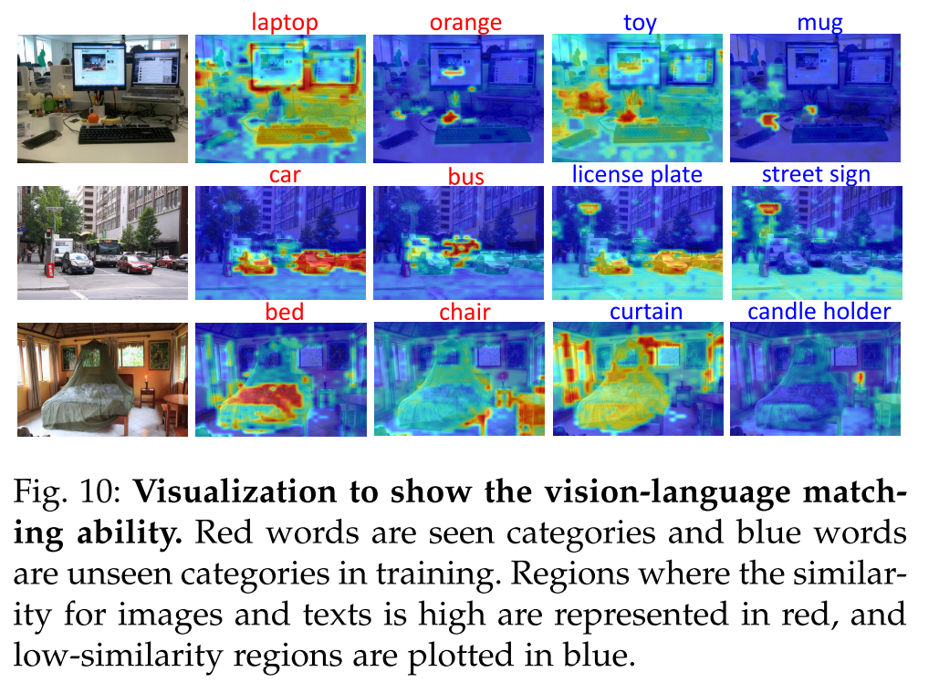 我们进一步提供了像素级可视化,以展示UniDetector在图10中的视觉-语言匹配能力。对于每张图像,我们显示了与四个类别词的相似性图。对于第一张图像,我们的模型将出现笔记本电脑的区域与类别词笔记本电脑匹配,具有最高的相似性分数。对于橙色词,橘子所在的位置具有最大的相似性分数。这同样适用于玩具和杯子词。视觉-语言匹配能力对于第二张和第三张图像同样强大。如我们所见,UniDetector对见过和未见的类别词匹配都很好。