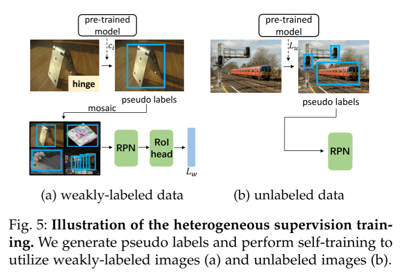 现有的检测器依赖于实例级注释进行全监督训练。为了利用弱标注和未标注图像进行异构监督训练,我们提出了通过伪标签进行自训练的方法。这个过程在图5中进行了说明。具体来说,我们首先用所有标注图像训练一个全监督检测器,这些图像都有类别标签和边界框注释。这个检测器以开放世界的方式训练,因此采用异构标签空间训练,提议生成和RoI分类解耦。然后,我们将这个预训练的全监督模型应用于弱标注和未标注图像以获得伪标签。具体如何获得它们的伪标签的细节在后续段落中介绍。最后,这些伪标签被视为真实标签,并用于监督检测器进行异构监督训练。
