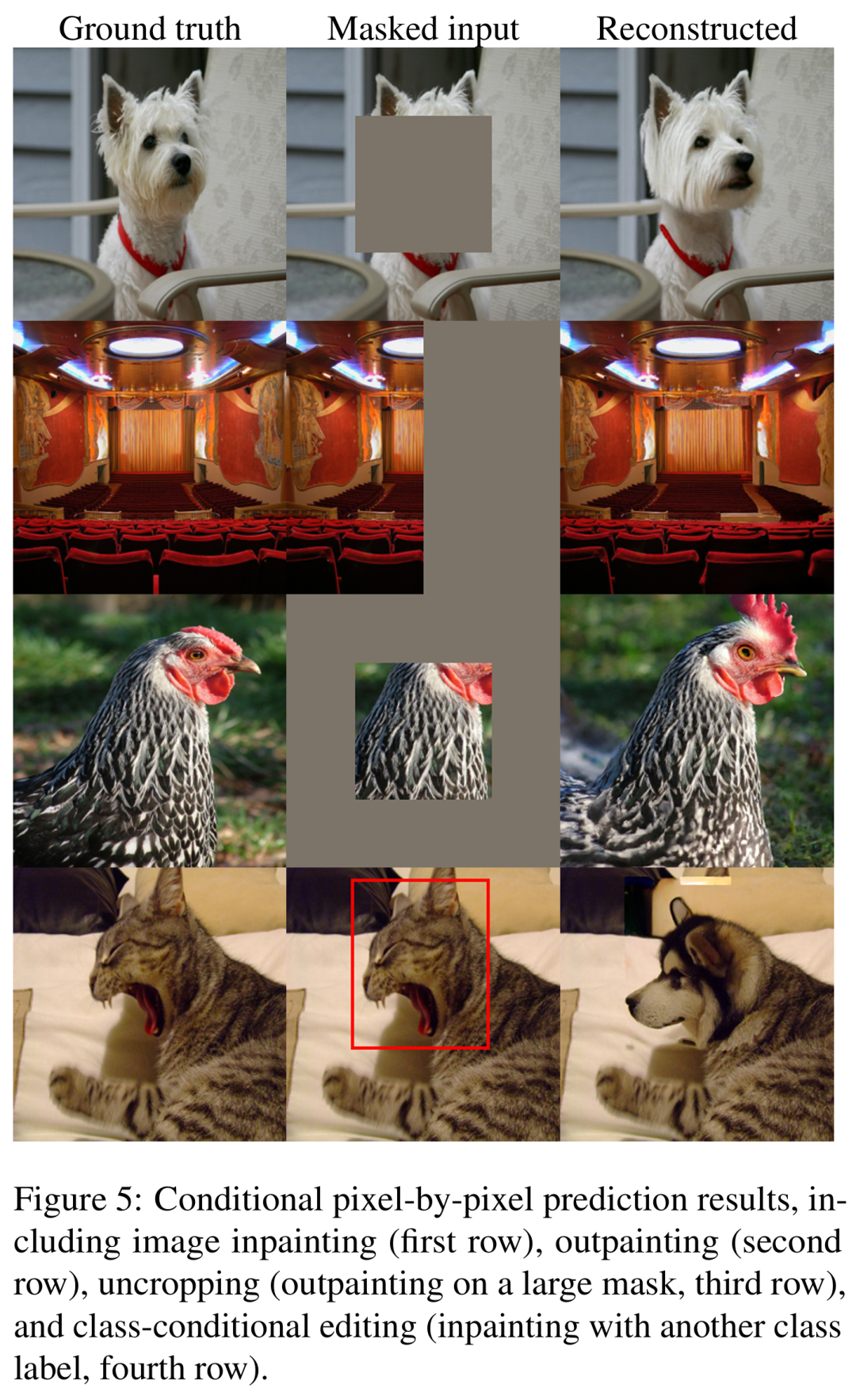 研究者进一步使用图像编辑中的常规任务来检验本文方法的条件逐像素预测性能。下图 5 提供了几个具体示例,包括修复、去除修复、取消裁剪和类条件编辑。
