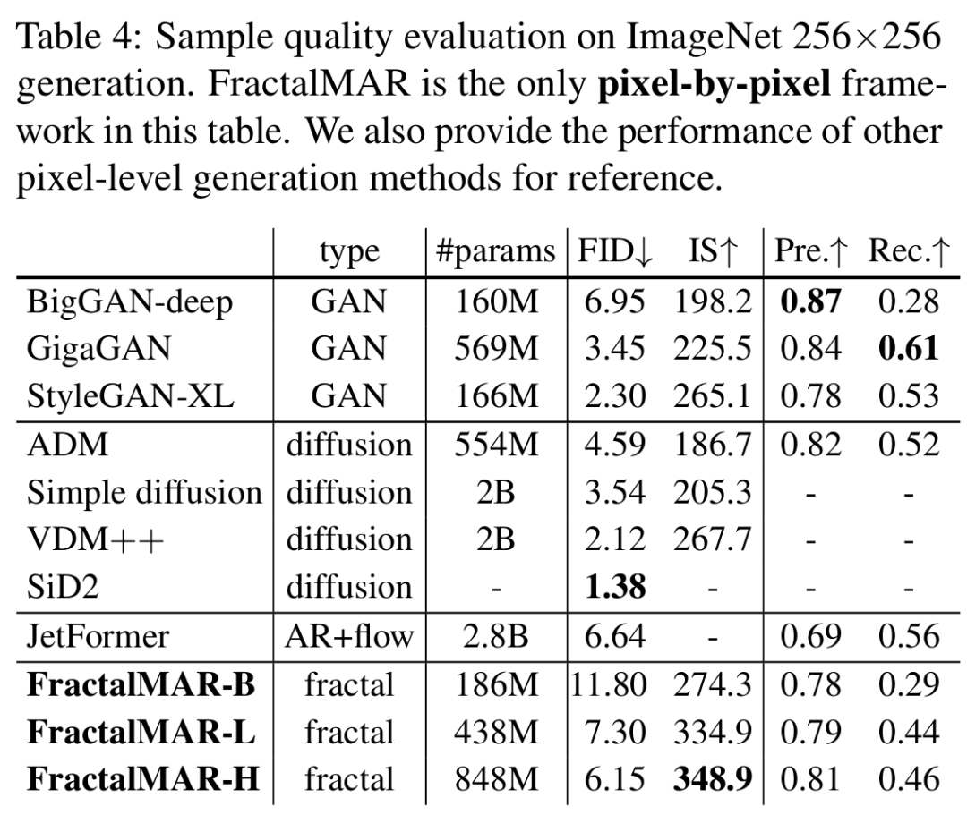 再来看生成质量评估。 研究者在分辨率为 256×256 的类条件图像生成这一挑战性任务上,使用四个分形级别对 FractalMAR 进行了评估。指标包括了 FID、Inception Score、精度和召回率,具体如下表 4 所示。