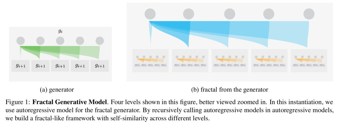 本文的分形生成模型的灵感来自于生物神经网络和自然数据中观察到的分形特性。与自然的分形结构类似,研究者设计的关键组件是定义递归生成规则的生成器,比如这样的生成器可以是自回归模型,如图 1 所示。在此实例中,每个自回归模型都由本身就是自回归模型的模块组成。